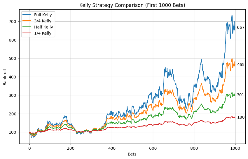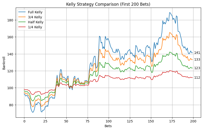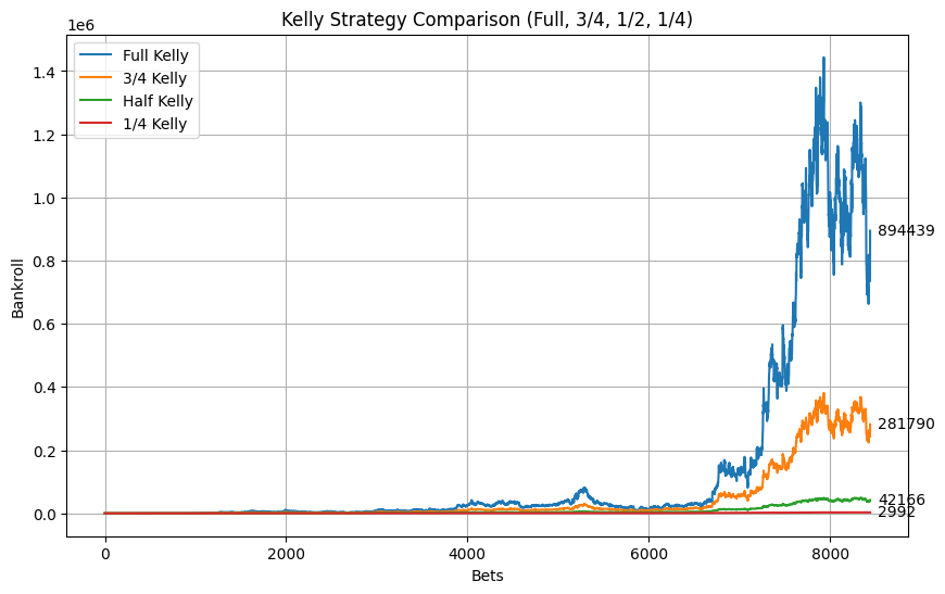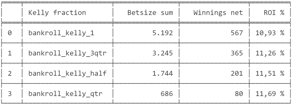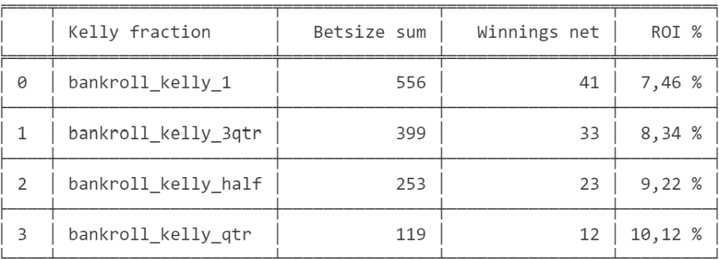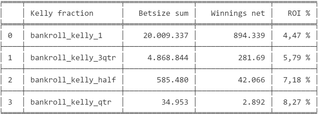 Mallin käyttämä panostus on toteutettu ns. kelly criterion -menetelmää (Kelly criterion – Wikipedia) varioimalla. Lopullisia kriteerin (EV+) mukaisia kohteita valikoitui aineistosta lopulta 8444 kpl. Pelikassa (Bankroll) on aloitushetkellä 100 yksikköä.